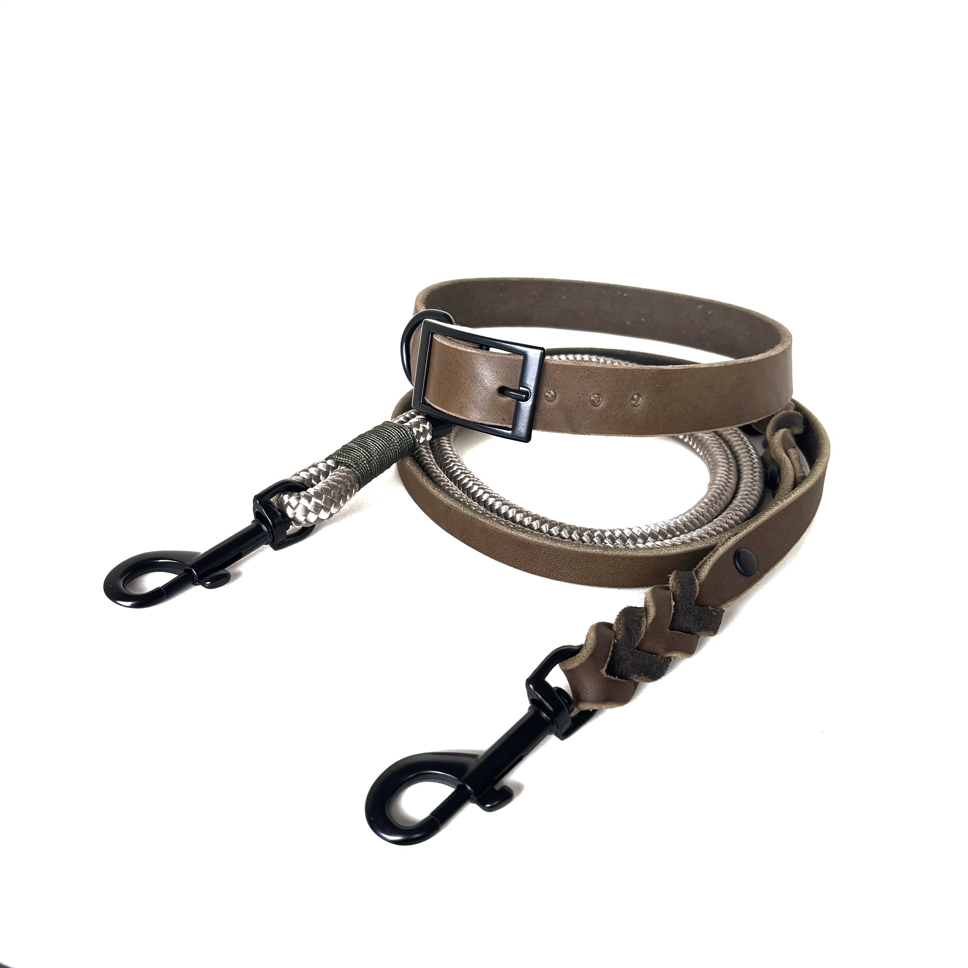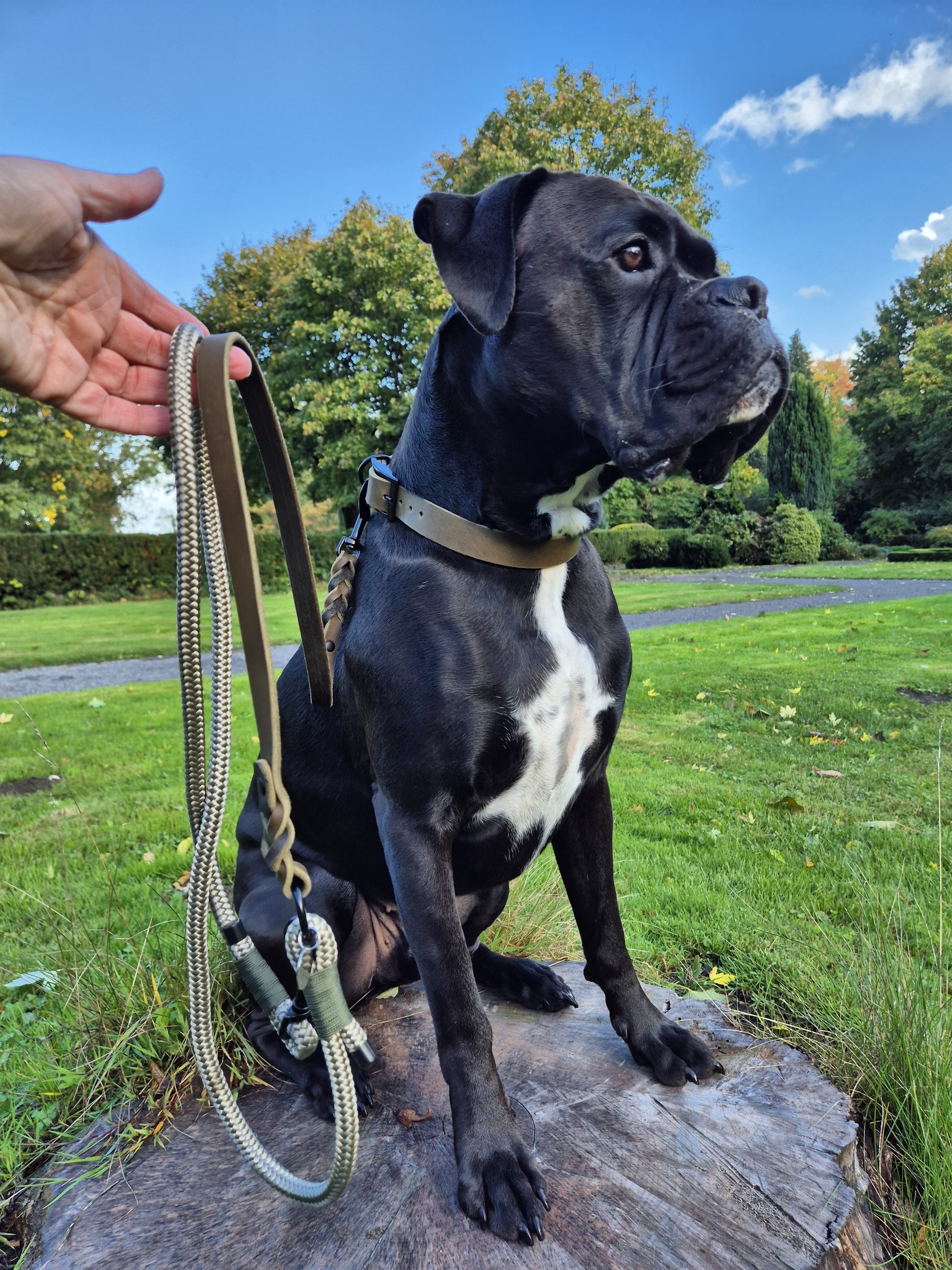 • Material: Hochwertiges, stabiles Leder in 15 mm Breite (auch in 12 mm verfügbar, allerdings nur für sehr zarte und kleine Hunde) und Robustes Tau in Kombination.