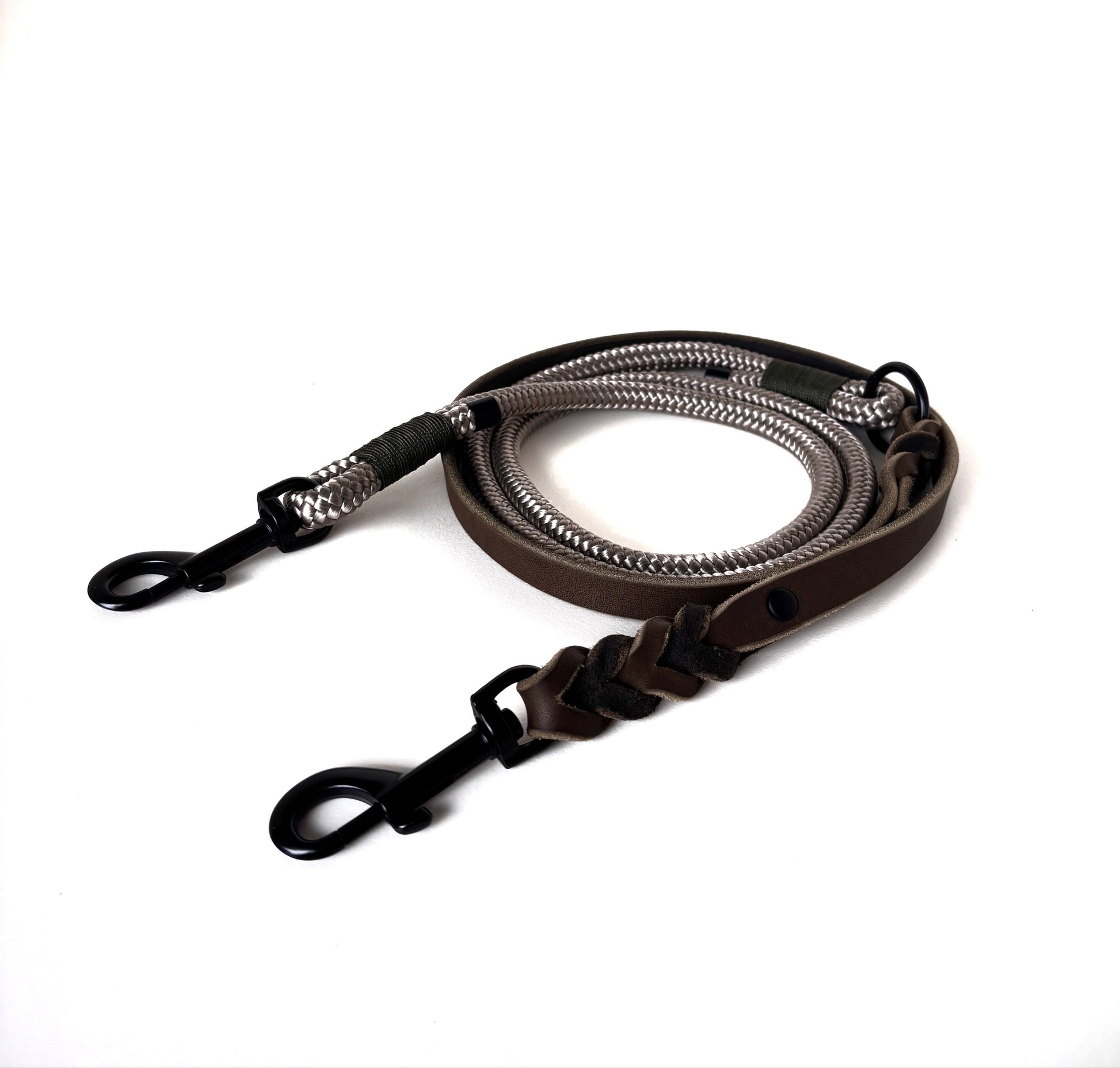 Unsere elegante, teilgeflochtene Fettleder Leine in Kombination mit Tau ist die perfekte Wahl für Hundebesitzer, die Wert auf Qualität, Stil und Flexibilität legen. Die geflochtenen Abschnitte sorgen für einen besonderen Hingucker, während das schlichte Tau im restlichen Teil für Eleganz und Komfort sorgt.